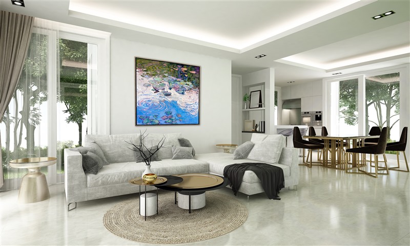Many houses are already fitted with some sort of recessed ceiling fixtures. These can be adapted to directional spot lighting with minor handyman work. Even without direct lighting on your painting, however, the artwork will still present well with nearby incandescent lighting. One thing to avoid is hanging your painting behind a hanging chandelier, which will cast a direct glare spot in the middle of the painting, without highlighting the natural colors and texture of the painting. A light that is angled from above, or even from the side, will allow you to see the thick brushwork, see each subtle variation in color, and truly enjoy your painting in a whole new light.