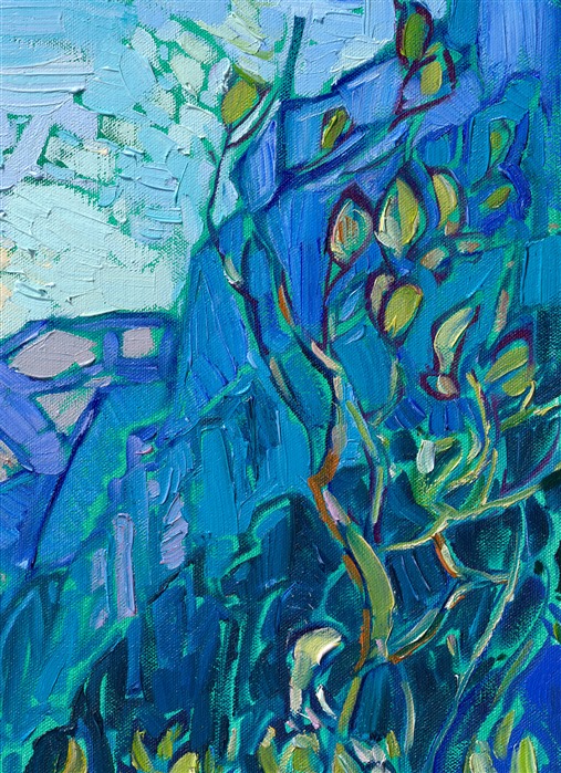 Naeroydalen is a popular valley in Norway that has spectacular and dramatic cliffs. This painting captures the rich colors and dramatic view from Stalheim Hotel, which is perched high on the side of the mountain and is only accessible via steep switchbacks. Thick brushstrokes of oil paint laid side by side on a viridian-toned canvas create a mosaic of color and texture that keeps the eye roaming through the piece.
