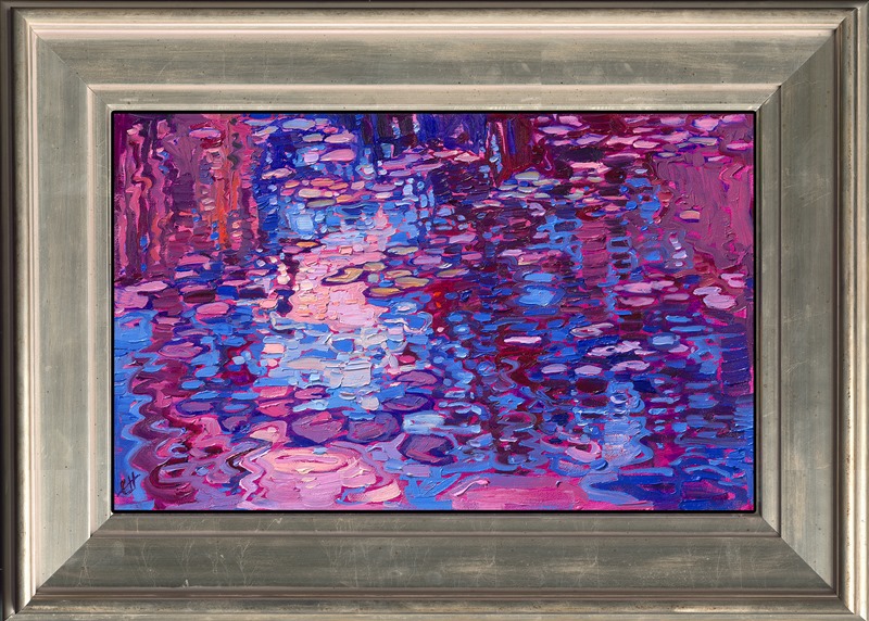 Limited Edition 3D Textured Replicas (edition of 100) are hand-signed and numbered by the artist and come with a Certificate of Authenticity. For the Limited Edition 3D Textured Replicas, we offer the same framing options that we use for Erin Hanson’s original oils: Gold EH Frame (burnished 23kt gold leaf floater frame with dark pebbled sides), Silver EH Frame (burnished sterling silver with dark pebbled sides), and three styles of wide, plein-air frames.