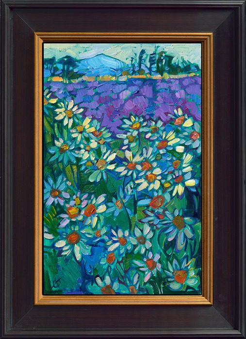 Limited Edition 3D Textured Replicas (edition of 100) are hand-signed and numbered by the artist and come with a Certificate of Authenticity. For the Limited Edition 3D Textured Replicas, we offer the same framing options that we use for Erin Hanson’s original oils: Gold EH Frame (burnished 23kt gold leaf floater frame with dark pebbled sides), Silver EH Frame (burnished sterling silver with dark pebbled sides), and three styles of wide, plein-air frames.