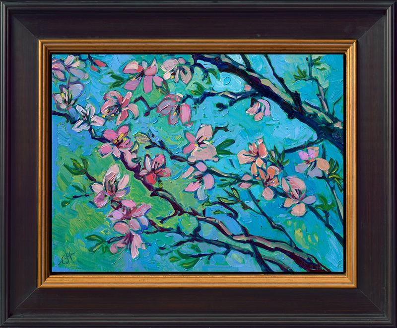 Petite blooms of a Japanese cherry tree radiate with color against a turquoise sky. Thick brush strokes of oil paint capture the transient beauty of sakura season in Japan.
